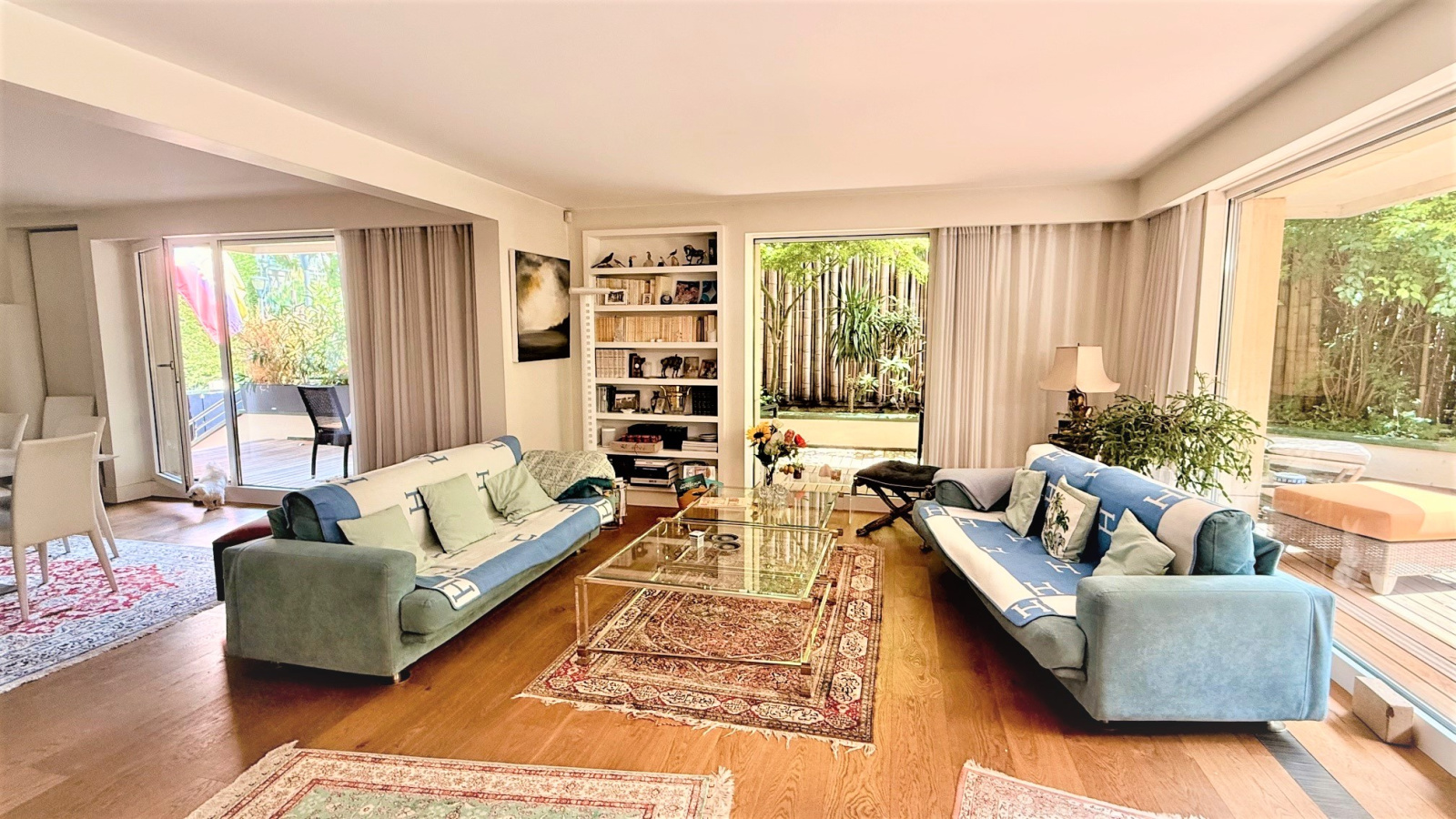 Lumineux salon-séjour avec larges baies vitrées, parquet bois massif et accès direct à la terrasse